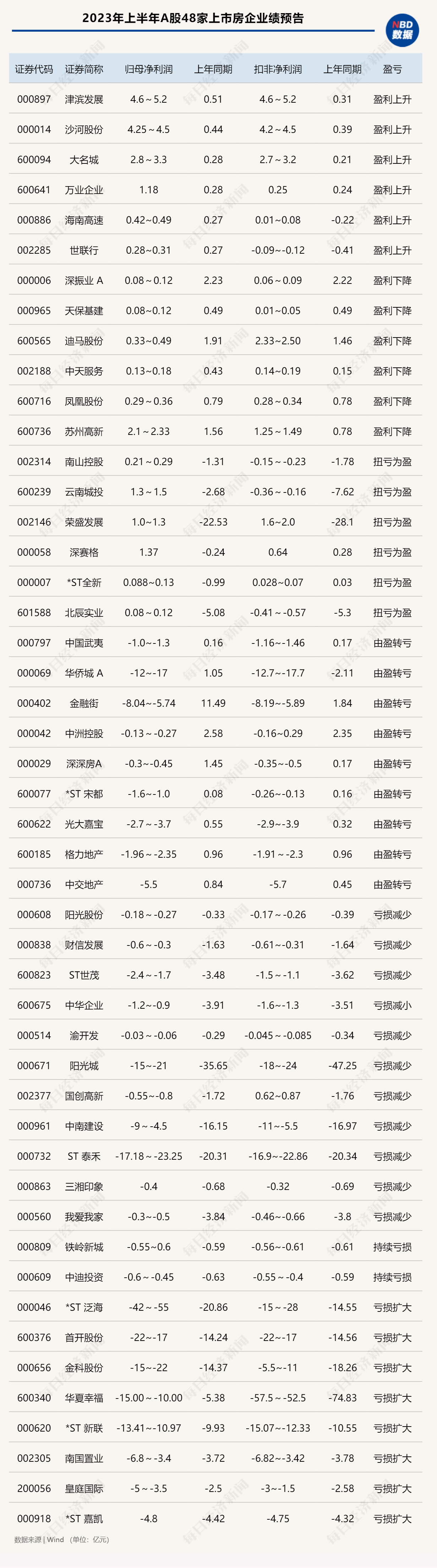据Wind统计,截至7月18日,已有48家A股涉房企业发布2023年中期业绩预告或业绩快报。其中,有18家房企预计盈利,其中6家房企盈利同比上升,6家房企盈利同比下降,6家房企扭亏为盈;30家房企归母净利润预计亏损,其中有9家房企同比由盈转亏,11家房企亏损同比减少,8家房企亏损同比进一步扩大。