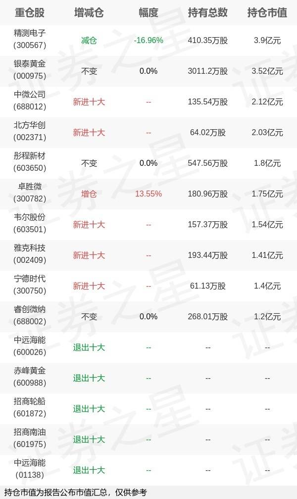 证券之星研究院讯,7月20日华夏基金郑泽鸿旗下基金公布2023年二季报,综合其旗下各基金报告,半导体行业板块个股更受其关注,与上季度相比,卓胜微等被增持,中微公司、北方华创、韦尔股份等新入十大重仓;航运行业板块则遭到减持,招商南油,招商轮船,中远海能等退出十大重仓;目前其旗下基金综合持仓排名前三个股为精测电子、银泰黄金、中微公司。