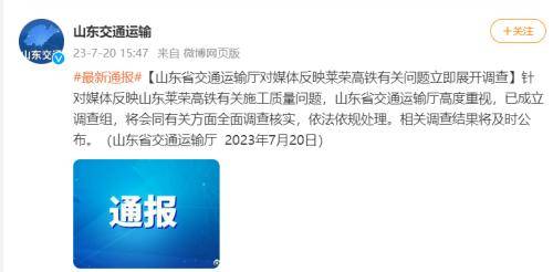 针对媒体反映山东莱荣高铁有关施工质量问题,山东省交通运输厅高度重视,已成立调查组,将会同有关方面全面调查核实,依法依规处理。相关调查结果将及时公布。(山东省交通运输厅 2023年7月20日)