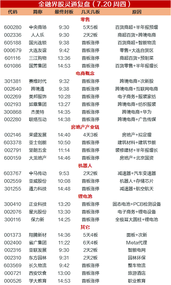 周四A股共29股涨停(不含ST股),5股封板未遂,连板股总数7只,为中央商场(半年报预增+零售)5连板,荣盛发展(房地产)、东方园林(园林环保)、亚联发展(智能电网)、人人乐(零售)、省广集团(Meta代理商)、中马传动(减速器)2连板。