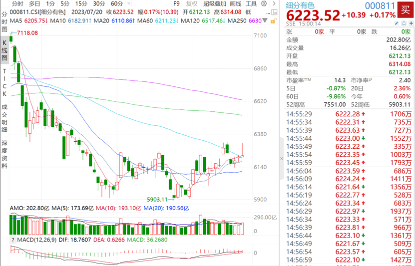 7月20日,A股三大股指高开低走,行业各板块涨跌不一。A股上游金属资源板块上涨,中证细分有色金属指数午后冲高回落,小幅收涨0.17%,实现三连阳!成份股中,华友钴业涨超4%,云铝股份涨超2%,中国铝业涨超1%,天齐锂业收涨0.63%,紫金矿业收涨0.16%;湖南黄金跌超5%,赤峰黄金跌超1%,驰宏锌锗收跌0.36%。