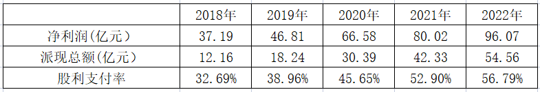 2018年,迈瑞医疗每十股派发红利10元,派现总额12.16亿元;2019年,迈瑞医疗每十股派发红利15元,派现总额18.28亿元;2020年-2023年,迈瑞医疗每十股分别派发红利25元、35元和45元。自A股上市以来,迈瑞医疗累计派现157.7亿元,且股利支付率逐年提高,累计分红金额是融资的2.6倍。