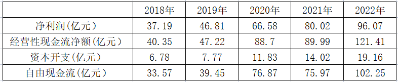 2018年-2022年,迈瑞医疗每年的经营性现金流净额均超过了同期净利润,说明公司盈利含金量高,是真的赚钱。而且,自由现金流逐年增加,由2018年的33.57亿元增长至102.25亿元。