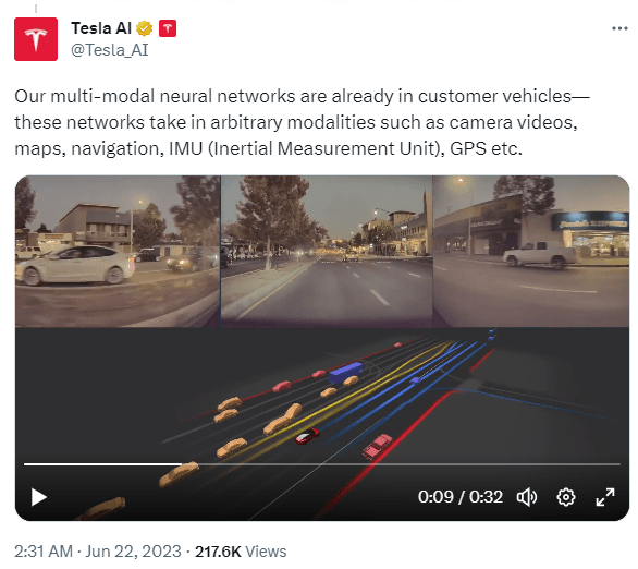 根据特斯拉AI推特账号的展示,特斯拉的多模态神经网络已经使用在客户车辆中,这些网络可以接受任意模态的数据,如摄像头视频、地图、导航、IMU (惯性测量单元) 、GPS等。