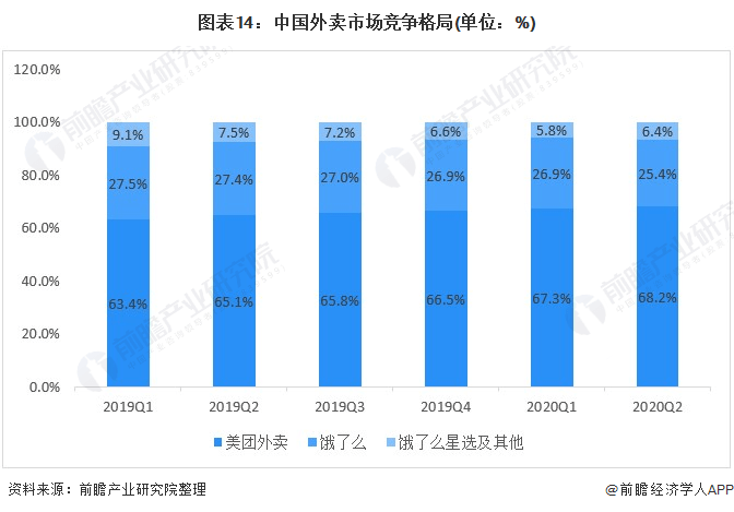 根据Trustdata发布的《2020年Q2中国外卖行业发展分析报告》,截至2020年上半年,美团外卖市场份额达到68.2%,饿了么占比25.4%。