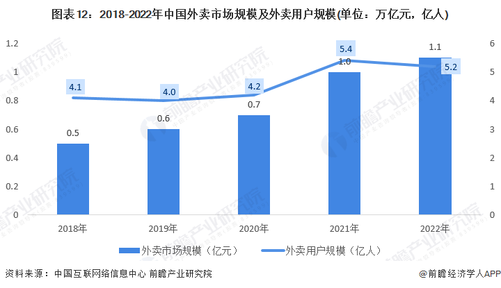 近年来,我国外卖行业发展迅猛。根据中国互联网络信息中心的数据,2022年中国外卖市场规模达到1.1万亿元,2018-2022年复合增长率超过20%。2022年中国外卖用户规模达到5.2亿人,较2018年增长了26.83%。预计未来几年,随着外卖服务场景的扩大和用户需求的深化,餐饮物流的不断优化以及居民消费的提升,外卖市场将保持持续强劲的增长态势。