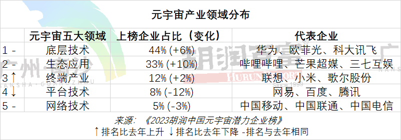 元宇宙五大产业领域中,底层技术类的上榜企业最多,有89家,以浪潮信息、全志科技为代表;生态应用类65家,以哔哩哔哩、芒果超媒为代表;终端产业类22家,以联想、歌尔股份为代表;平台技术类15家,以网易、百度为代表;网络技术类9家,以中国移动、中国电信为代表。