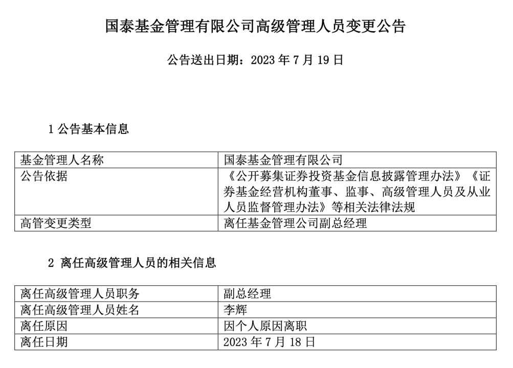 红星资本局7月20日消息,国泰基金于7月19日发布高级管理人员变更公告,公告称该公司副总经理李辉因个人原因离职,离职日期为7月18日。