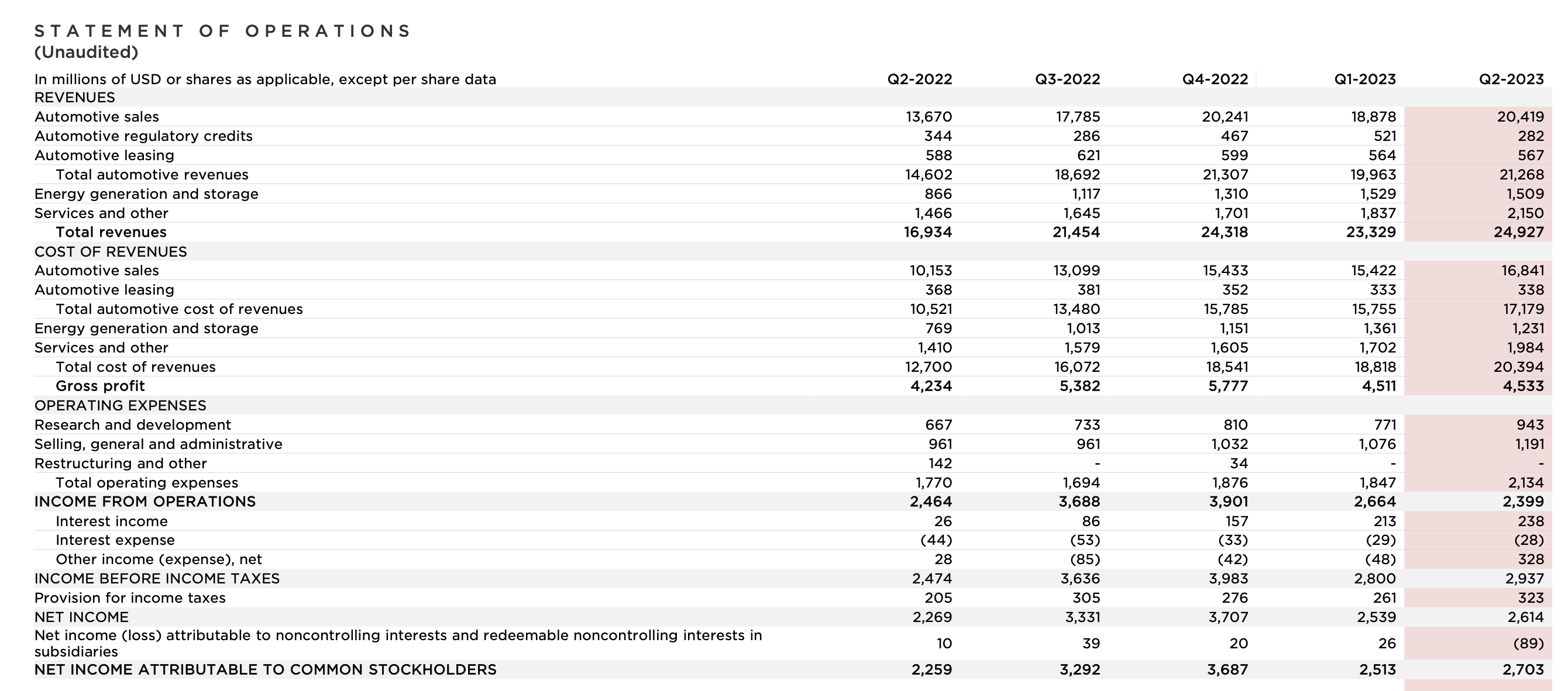 美东时间7月19日,特斯拉发布2023年二季度财报。期内,特斯拉实现营收249.27亿美元,同比增长47%,高于市场预期;GAAP毛利率18.2%,同比环比均有所下跌;GAAP净利润27.03亿美元,同比增长20%;截至期末的自由现金流为10.1亿美元。