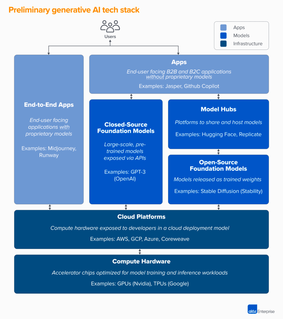 硅谷知名风投机构A16Z描绘了目前生成式AI技术栈的图景,相较于自身拥有模型的应用,没有模型的应用需要紧紧依靠大模型公司的支撑。“Jasper们”和OpenAI的竞争,本质上是应用层与模型层的竞争。