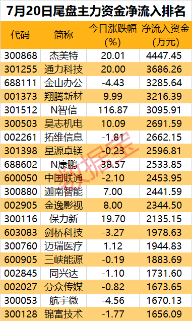从个股看,有13股尾盘净流入资金超2000万元。2只创业板热门股杰美特和通力科技今日20cm涨停,尾盘净流入均超3600万元。