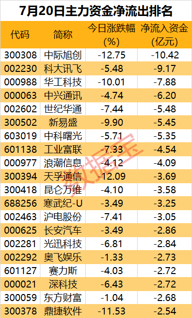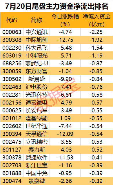 数据宝统计,16股尾盘主力资金净流出超5000万元。4只行业巨头尾盘净流出金额均超1亿元,分别为中兴通讯、中际旭创、科大讯飞、中科曙光。