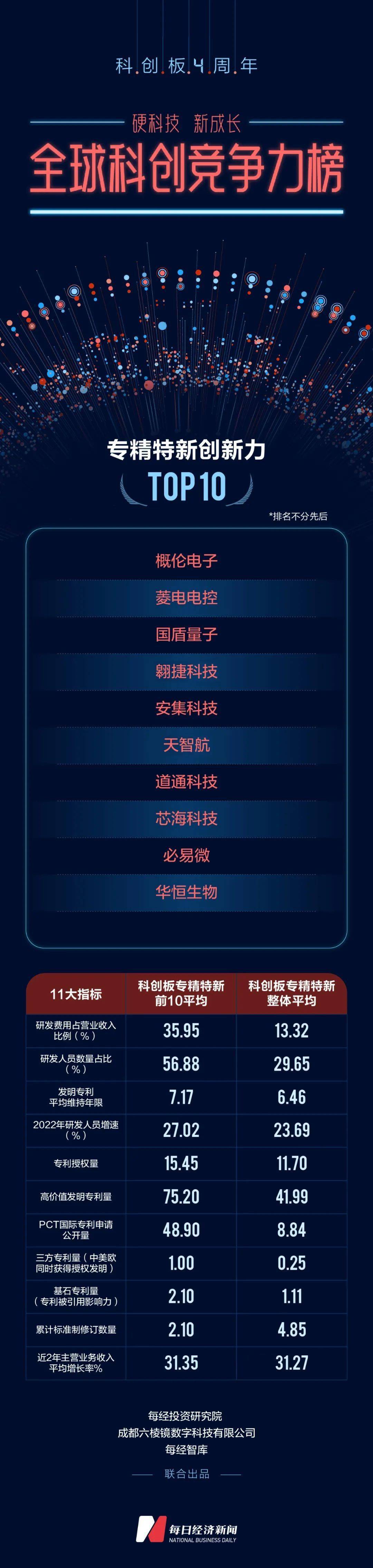 在“科创板全球科创竞争力排行榜”系列榜单中,由每经投资研究院、成都六棱镜以及每经智库联合研发和提供数据支持的“科创板专利转化创新力10强”“科创板专精特新创新力10强”以及“科创板创新力机构贡献10强”三大特色子榜单同样颇有看点。