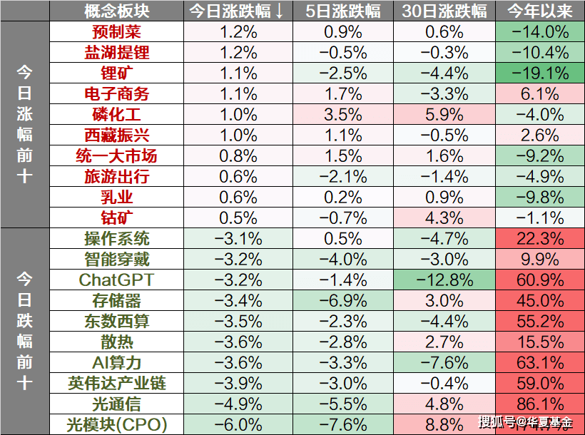 概念主题方面,预制菜、盐湖提锂、锂矿板块领涨,光模块(CPO)、光通信、英伟达产业链板块下跌。