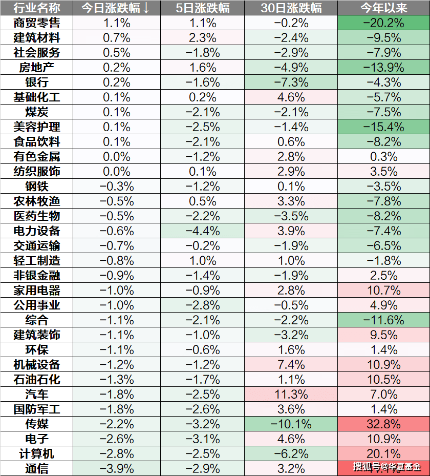 行业上来看,商贸零售、建筑材料、社会服务上涨,通信、计算机、电子下跌。