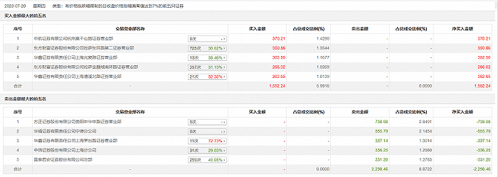 7月20日,国芳集团今日涨停,龙虎榜数据显示,上榜营业部席位全天成交3850.7万元,占当日总成交金额比例为14.86%。其中,买入金额为1552.24万元,卖出金额为2298.46万元,合计净卖出746.21万元。