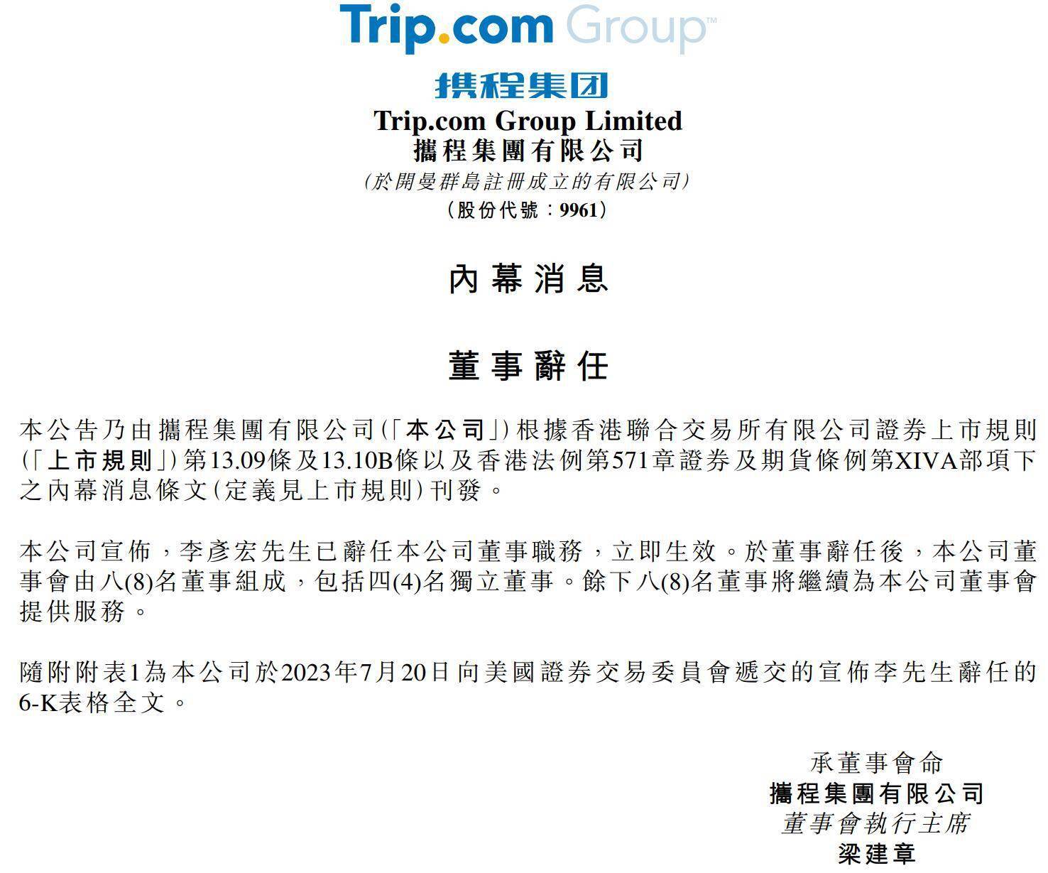 IT之家 7 月 20 日消息,携程集团今日在港交所发布公告称,李彦宏已辞任公司董事职务,立即生效。