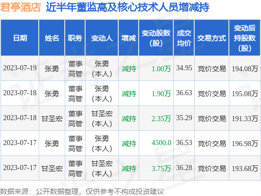 君亭酒店近半年内的董监高及核心技术人员增减持详情如下: