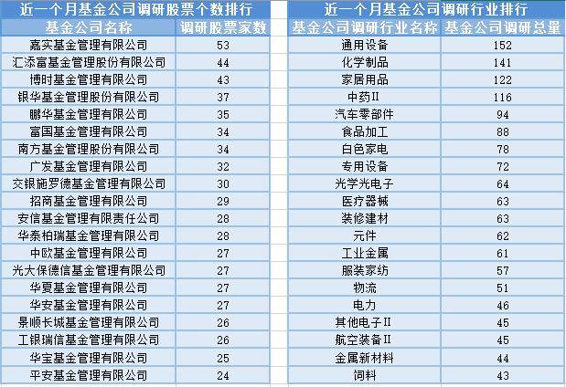 近一个月(6月20日-7月20日),嘉实基金参与公司调研的数量最多,共调研53家上市公司,然后调研较为活跃的还有汇添富基金、博时基金和银华基金,分别调研44家、43家、37家上市公司;从调研行业上来看,基金公司对通用设备行业的上市公司调研次数最多,共有152次,其次是化学制品行业,基金公司调研了141次。