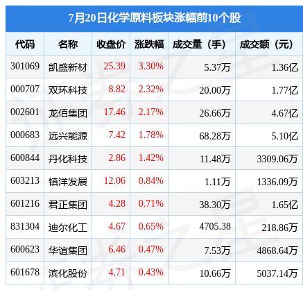 7月20日化学原料板块较上一交易日下跌0.41%,航锦科技领跌。当日上证指数报收于3169.52,下跌0.92%。深证成指报收于10816.27,下跌1.06%。化学原料板块个股涨跌见下表: