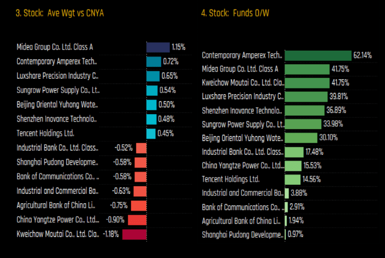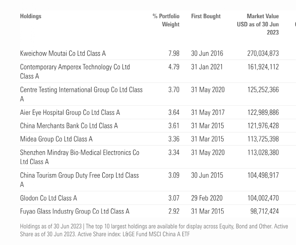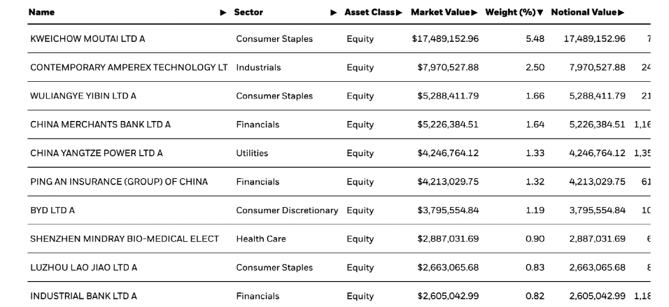 我们以贝莱德旗下跟踪MSCI中国A股指数的ETF CNYA来看。CNYA目前前十大重仓股为贵州茅台、宁德时代、五粮液、招商银行、长江电力、中国平安、比亚迪、迈瑞医疗、泸州老窖、兴业银行。其中贵州茅台占比为5.48%,宁德时代占比为2.50%。