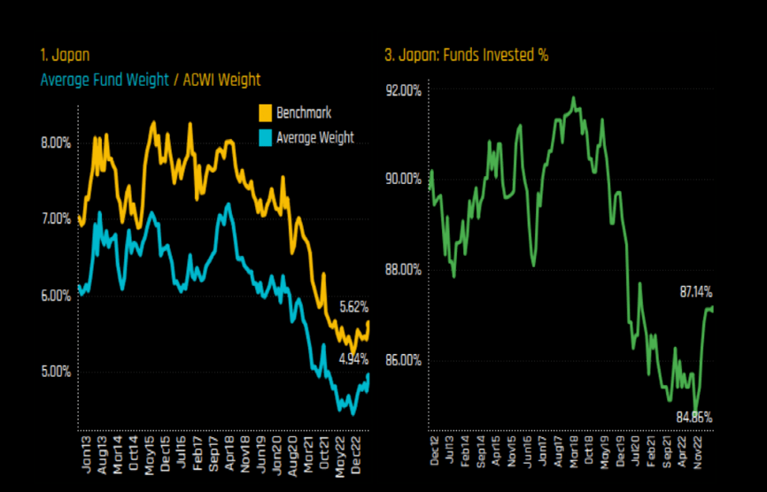 Copley Fund Research收录的350只全球主动管理基金显示, 2022年9月底,这些基金中84.9%的投资了日本股市,处于历史地位。Copley Fund Research 覆盖的全球主动管理股票基金合计规模约9400亿美元,约折合6.74万亿元人民币。截至5月底,这一数值已经上升到了87.14%。值得注意的是与MSCI全部国家世界指数相比,日本过去10年一直被低配,但是低配的幅度已经缩小。截至5月底,这一类别基金平均持仓相较于参照基准仅低配0.69个百分点。