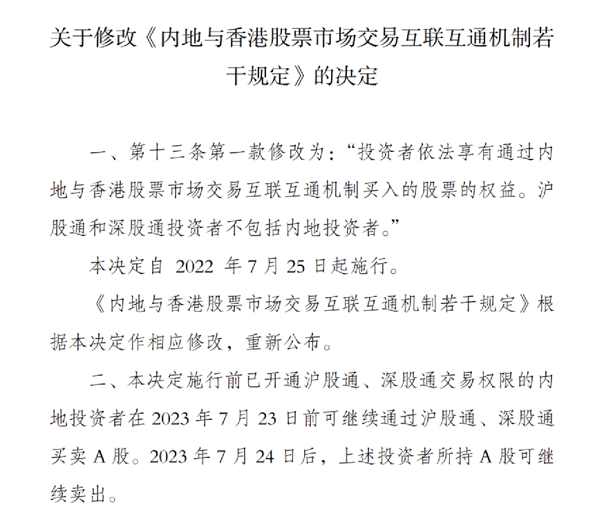 根据规定,2023年7月24日之后,内地开通了沪股通、深股通交易权限的投资者,通过相关渠道所持有的A股可继续卖出,但是不能继续买入。