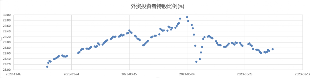 这里需要注意的是:当股票被买爆之后,外资不能通过股票互联互通下单继续买,还能通过QFII通道继续买入。此后外资持有比例降低,但是一直维持在28%以上。