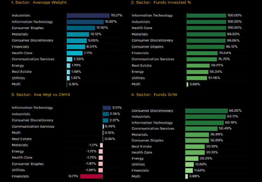 103只海外基金平均持仓与MSCI中国A股指数相比,基金平均对信息技术超配3.51个百分点;对工业超配2.56个百分点;对可选消费超配2.37个百分点。从基金数量来看,66.02%的基金超配了可选消费、63.11%的基金超配了工业、60.19%的基金超配了信息技术。
