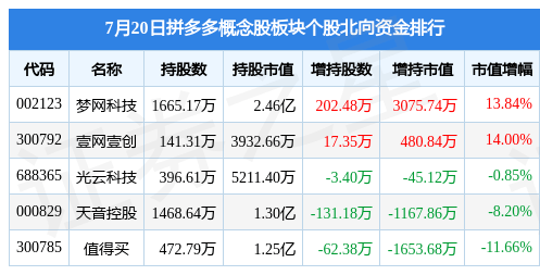 北向资金方面,当日拼多多概念股板块北向资金持股市值为5.92亿元,增持689.92万元。其中增持最多的是梦网科技,增持了0.31亿元。减持持最多的是值得买,减持了0.17亿元。拼多多概念股板块北向资金持股变动明细见下表: