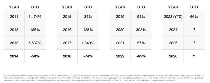 霍斯利表示,加密货币的历史可以分为几个四年周期。他说:“从历史上看,比特币和加密空间会上涨三年,然后进入熊市,通常会下跌60%到70%。”