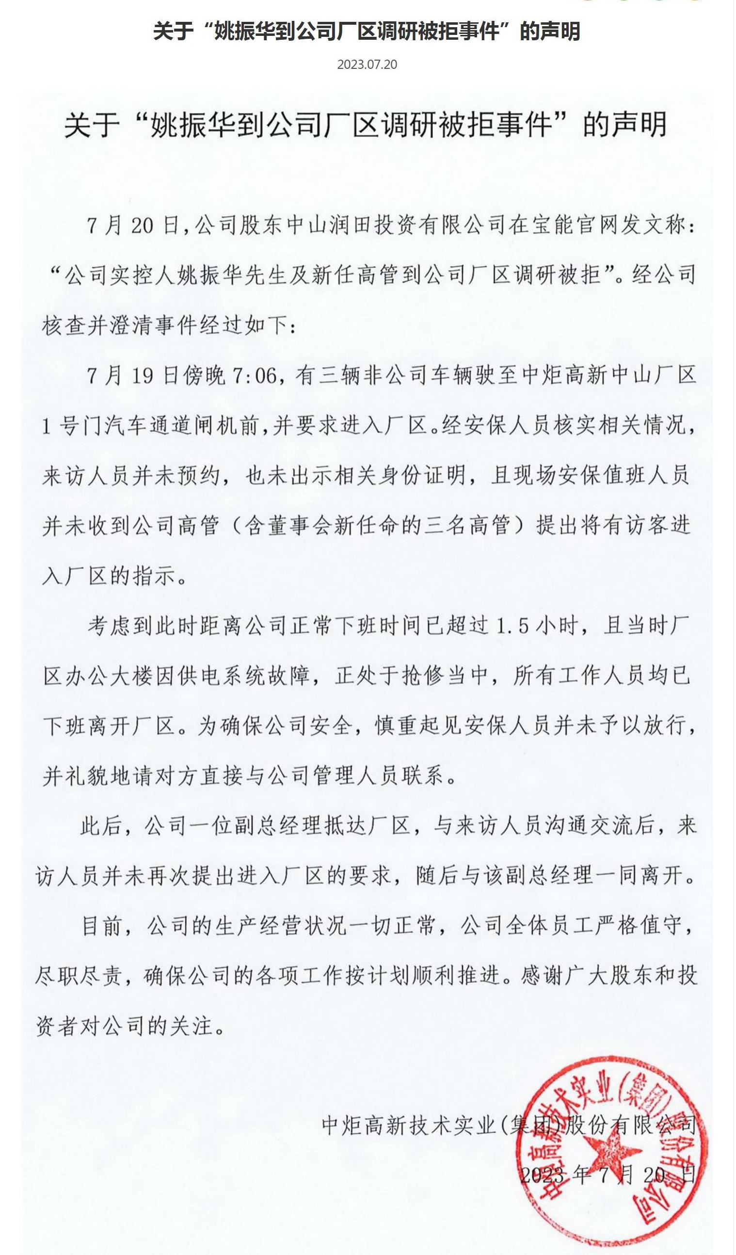 实控人姚振华被厂区保安拒入,中炬高新回应
