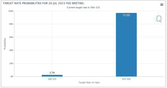 美联储7月加息25个点或被看作是“板上钉钉”。芝商所(CME)美联储观察(FedWatch)工具预测数据显示,截至7月18日,美联储7月26日会议保持5%至5.25%的联邦基金利率目标区间的概率为2.7%,加息25个基点的概率为97.3%。
