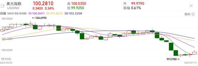 要知道的是,6月以来美元指数持续下行,进入7月,美元指数更是连跌6日跌破了100的关口。上周五消费者信心公布后,美元指数一度逆转下跌趋势并重上100。不过拉长时间来看,美元指数仍呈现下跌趋势,而这主要由于市场对于美联储会在7月加息后结束加息周期的预期而造成的美元多头平仓潮。