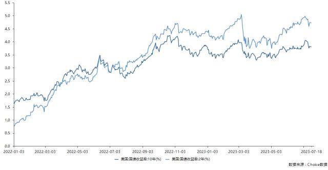 与此同时,作为衡量通胀情况的重要指标,6月CPI和PPI数据的超预期回落提振消费者信心的同时,也让越来越多的人认为7月末的加息将是美联储本轮加息周期中的最后一次。在上述预判下,短期内美元指数、美债价格及美债收益率均出现波动。