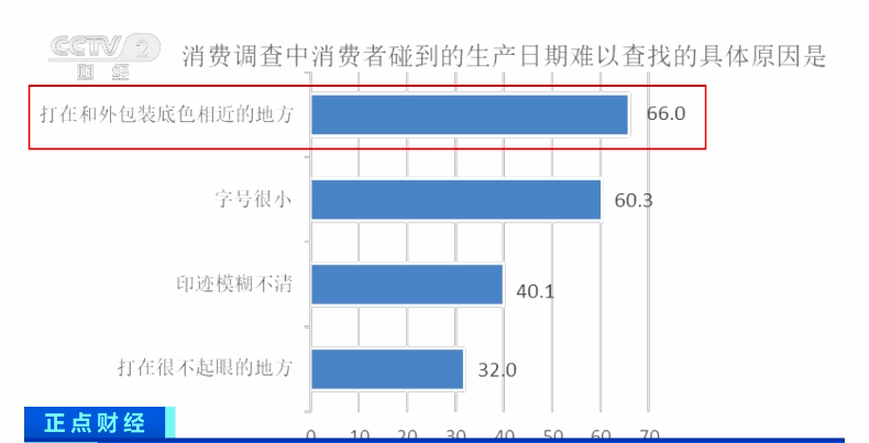 上海市消保委调查显示:消费者碰到的生产日期难以查找的原因,有66%是因为打在和外包装底色相近的地方;60.3%为字号很小;40.1%为印迹模糊不清;32%为打在很不起眼的地方。