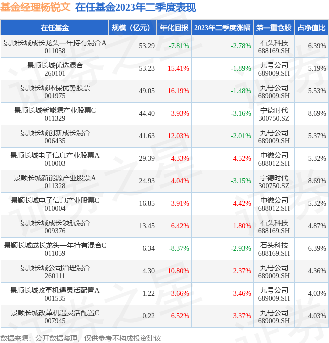 截止2023年二季度末,基金经理杨锐文旗下共管理13只基金,本季度表现最佳的为景顺长城电子信息产业股票A(010003),季度净值涨4.52%。