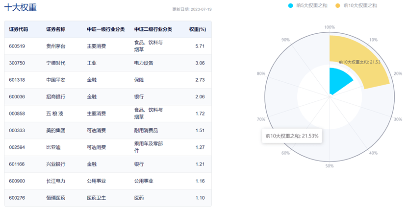 截至2023年7月19日,该指数的前十大权重股包括贵州茅台、宁德时代、中国平安、招商银行、五粮液等各行业龙头个股,前十大权重股集中度21.53%。(数据来源:中证指数公司,指数成份股不代表个股推荐)