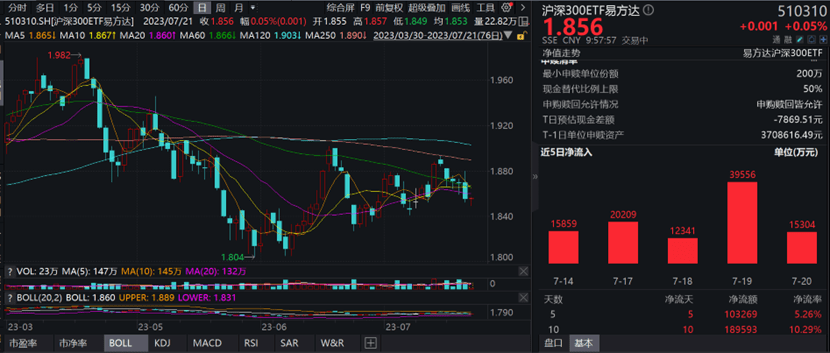 截至9:57,沪深300ETF易方达(510310)现报1.856元,微涨0.05%,成交额已达4200万元,成交额持续放大,市场交投活跃。数据显示,沪深300ETF易方达(510310)最近连续10个交易日获得资金净流入,合计“吸金”约19亿元。