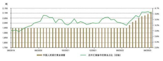 6月,中国人民银行宣布黄金储备增加21吨,黄金储备总量达2,113吨(图8),占中国外汇储备总额中的4%。这是中国央行连续第八个月报告购入黄金,在这八个月期间,中国官方黄金储备已累计增加165吨。2023年上半年,中国官方黄金储备共增加103吨。
