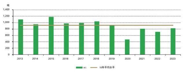图5:2023年上半年上游实物黄金需求回升,但仍低于长期平均水平