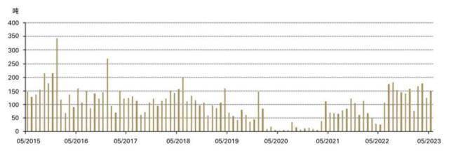 5月,中国黄金进口量为148吨,较上月增加24吨。与2022年5月主要城市实施严格的疫情防控政策时相比,进口量大幅增加121吨。(作者系世界黄金协会高级分析师)