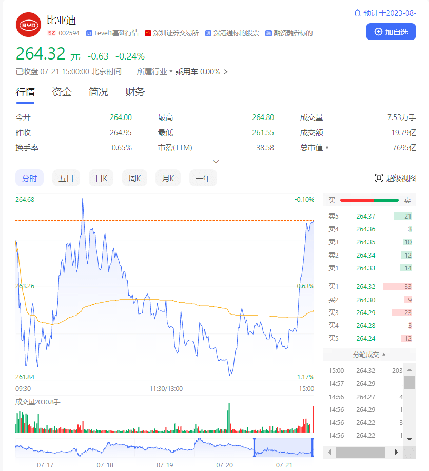 截止周五收盘,比亚迪A股有所回升,最高报264.80元,总市值 7695亿;港股也是一路走高,最高267.8元,市值7773亿元。