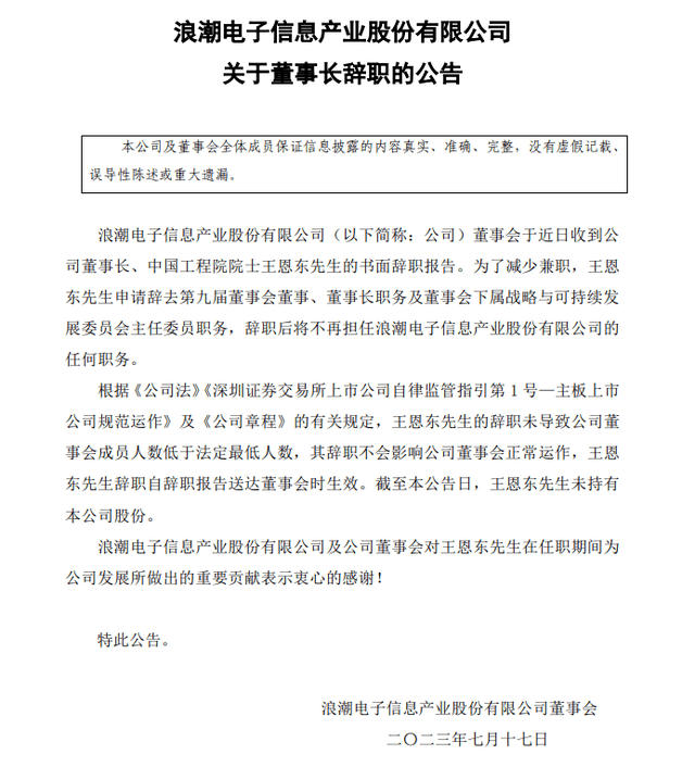 7月17日晚,浪潮电子信息产业股份有限公司(000977)发布公告称,公司董事长、中国工程院院士 王恩东申请辞去公司相关职务。