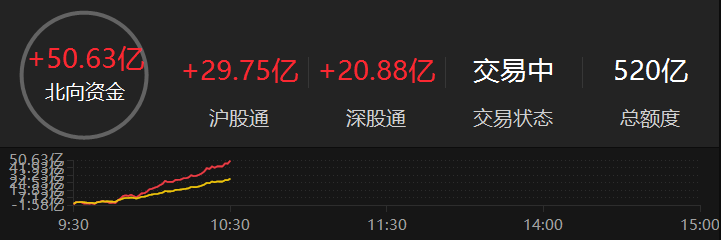 上证报中国证券网讯 截至10时31分,北向资金净流入达50亿元。其中,沪股通渠道净流入29.75亿元,深股通渠道净流入20.88亿元。