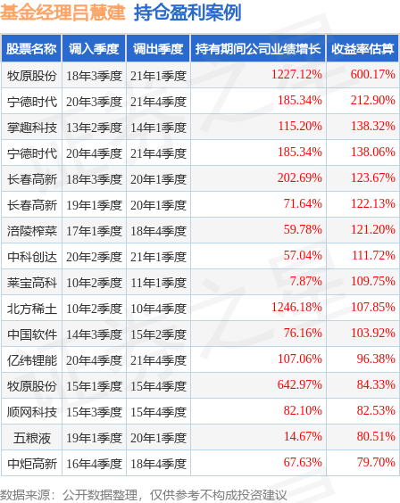 吕慧建管理的华泰柏瑞健康生活混合基金在18年3季度买入牧原股份,在持有2年又2个季度后在21年1季度卖出。持有期间的估算收益率为600.17%,持有期间牧原股份在2018年到2021年的年报归属净利润增幅达1227.12%。