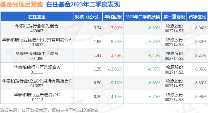 截止2023年二季度末,基金经理吕慧建旗下共管理6只基金,本季度表现最佳的为华泰柏瑞行业领先混合(460007),季度净值跌6.39%。