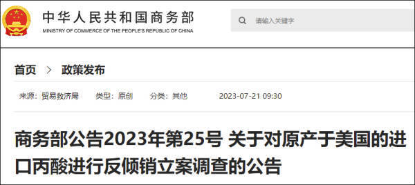 自本公告发布之日起,商务部对原产于美国的进口丙酸进行反倾销立案调查,本次调查确定的倾销调查期为2022年4月1日至2023年3月31日,产业损害调查期为2019年1月1日至2023年3月31日。