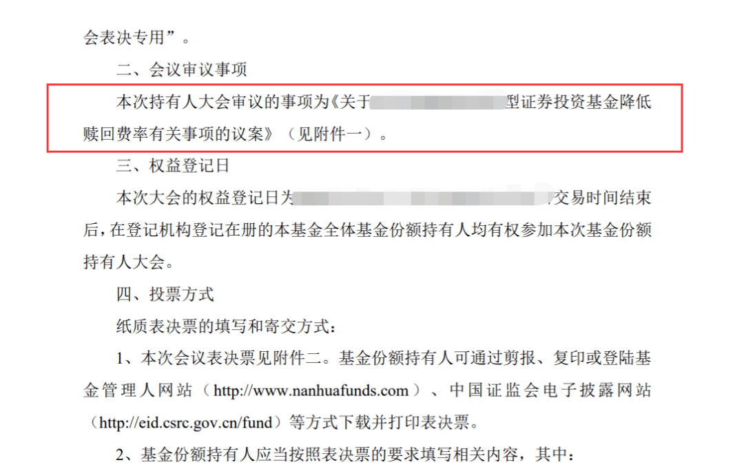 比如,在近期基金业大降费基调下,某公募旗下一只基金出于渠道合作需求,要上调管理费并下调托管费,并通过召开持有人大会来审议相关议案。 该基金持有人大会召开的提示公告中,审议议案的名称写为《关于XX基金修改基金合同有关事项的议案》,而不是《关于XX基金调整基金管理费率及托管费率的议案》。究竟为何修改基金合同,需要翻阅到公告最后一页,才看到提高管理费和下调托管费的具体信息。而这类关键信息,在整个公告中仅出现一次。