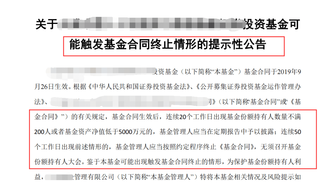 对基金公司而言,这是一种会带来负面影响的公告,比如会被媒体机构看到,因此个别公司会对标题进行信息模糊化处理。比如,上海和深圳地区若干家大型公募,会将这类公告的标题写成《关于XX基金的提示性公告》,而规范性的标题应为《关于XX基金基金资产净值连续低于5000万元的提示性公告》或《关于XX基金可能触发基金合同终止情形的提示性公告》。
